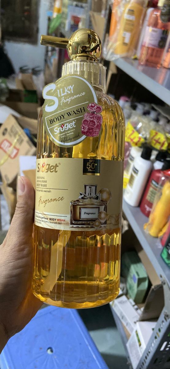 Sữa tắm Sroget Silky Whitening (dung tích 800 ml) được quảng bá là có công dụng làm trắng và trẻ hóa da, giúp da mềm mại, mịn màng mà không làm khô da